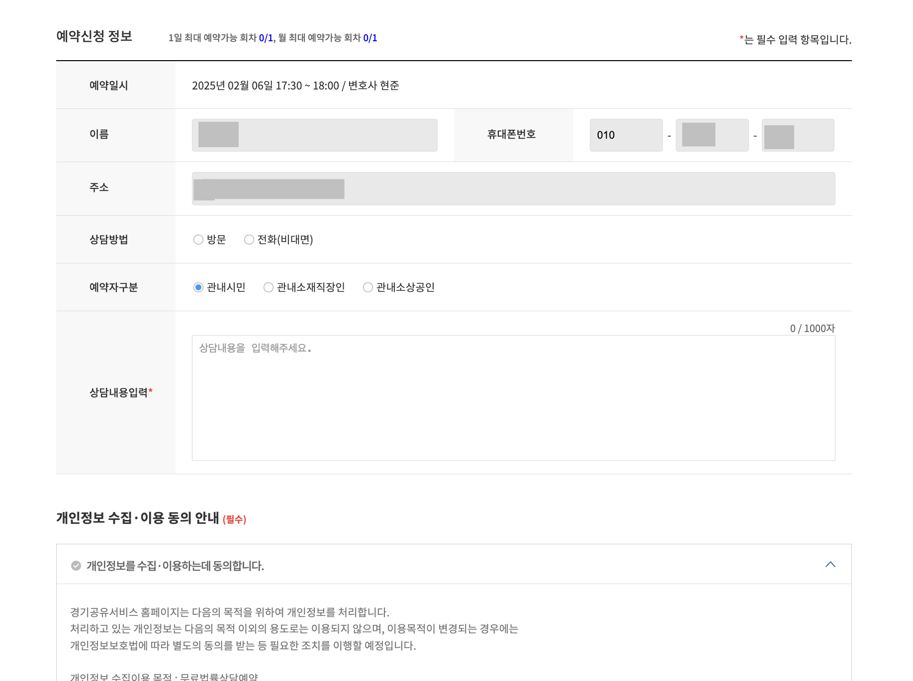 예약신청 정보를 상세하게 작성합니다. 상담 내용을 꼼꼼하게 적어주시면 빠른 상담에 도움이 될 것 같습니다.