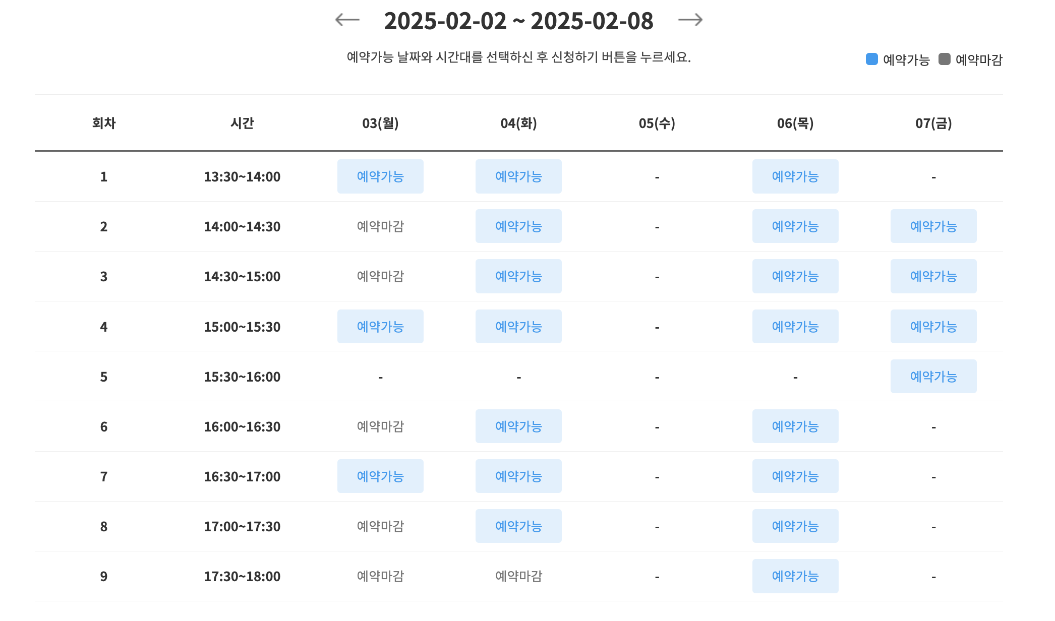 예약가능 날짜와 시간대를 선택합니다. 상담 시간은 30분 정도로 이용하실 수 있습니다.