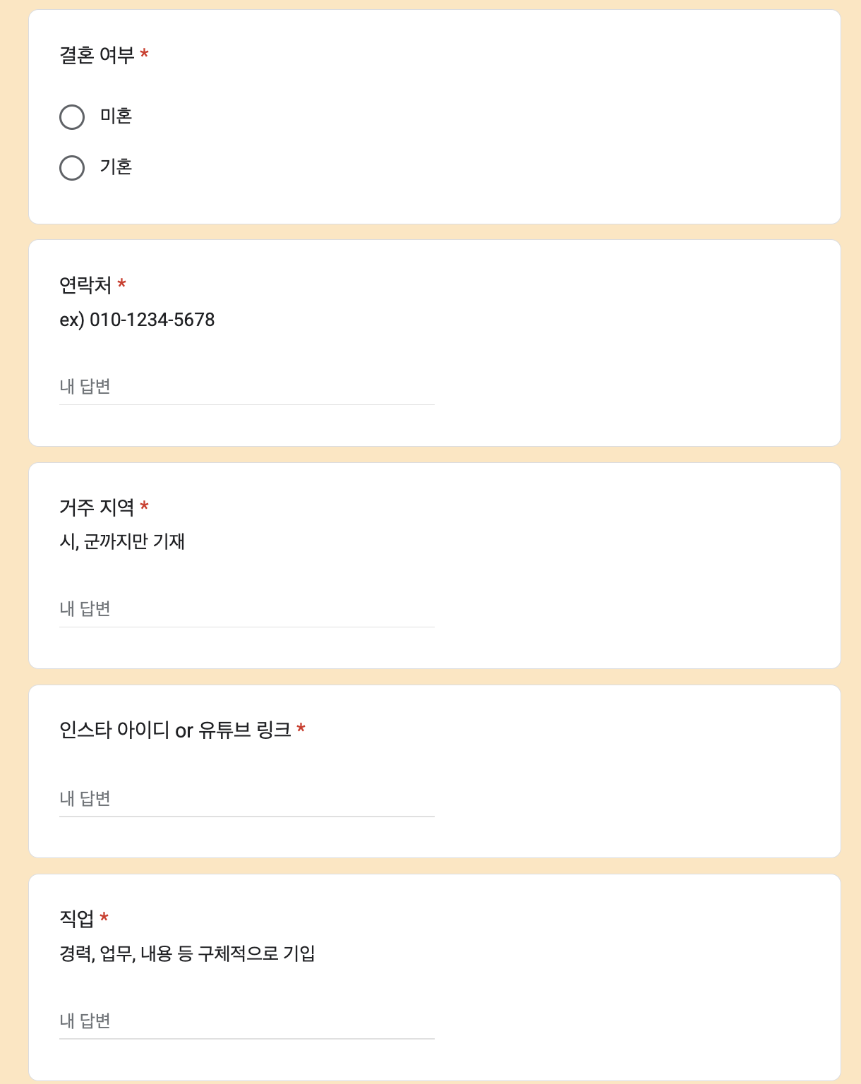 사진, 이름, 성별, 생년월일, 국적, 결혼여부, 연락처, 거주지역, 인스타 아이디, 직업 등 꽤 여러가지를 묻네요~